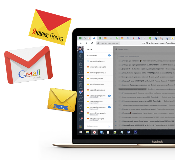 Получайте почту в CRM, переписывайтесь с клиентами, отправляйте коммерческие предложения, используйте шаблоны Email, чтобы ускорить коммуникации. Создавайте сделки из писем и читайте всю переписку с клиентом в его сделке. Подключайте разные почтовые ящики и не теряйте клиентов.